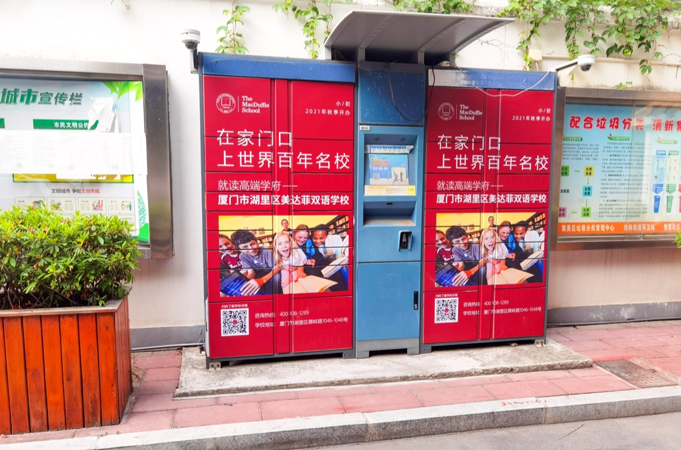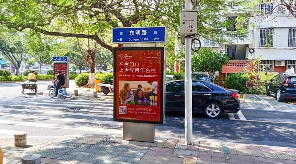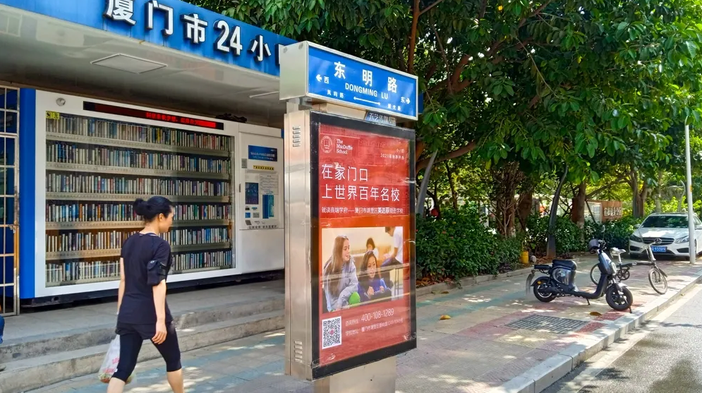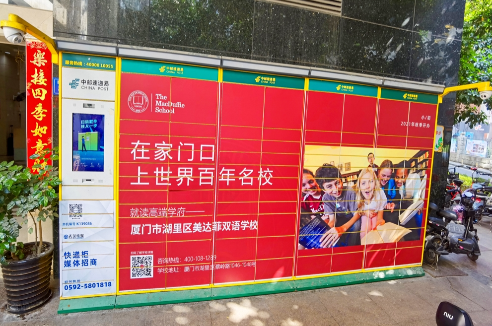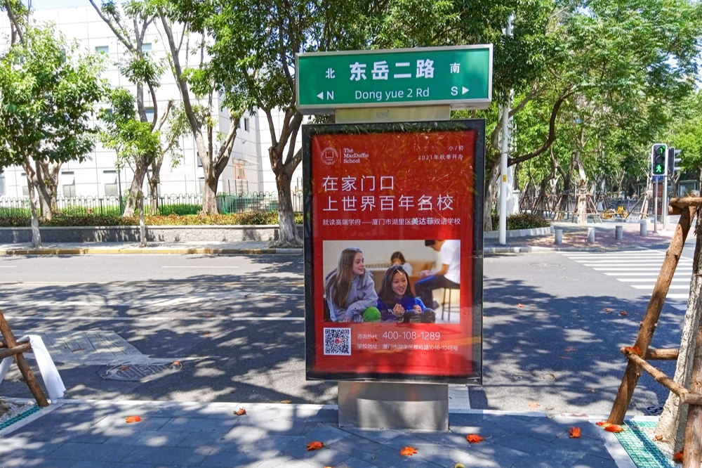 美達菲在廈門確定扎根后,重視線上線下的一系列宣傳告知,年后即開始在廈門戶外多個渠道進行大范圍的宣傳推廣,以“在家門口,上世界百年名校”為口號,集中在五緣灣、觀音山、會展、萬達廣場、蔡塘廣場等多個中高端商圈、商務(wù)圈,以及仙岳路、廈禾路、嘉禾路等多個主干道進行城市路名牌的投放,同時在島內(nèi)多個高端住宅小區(qū)的快遞柜進行大幅畫面展示。