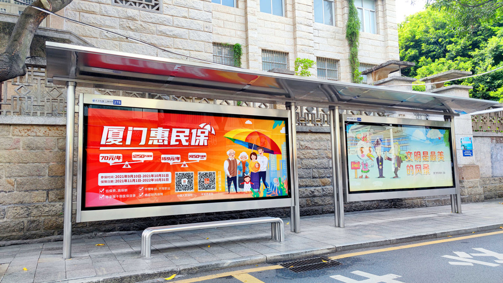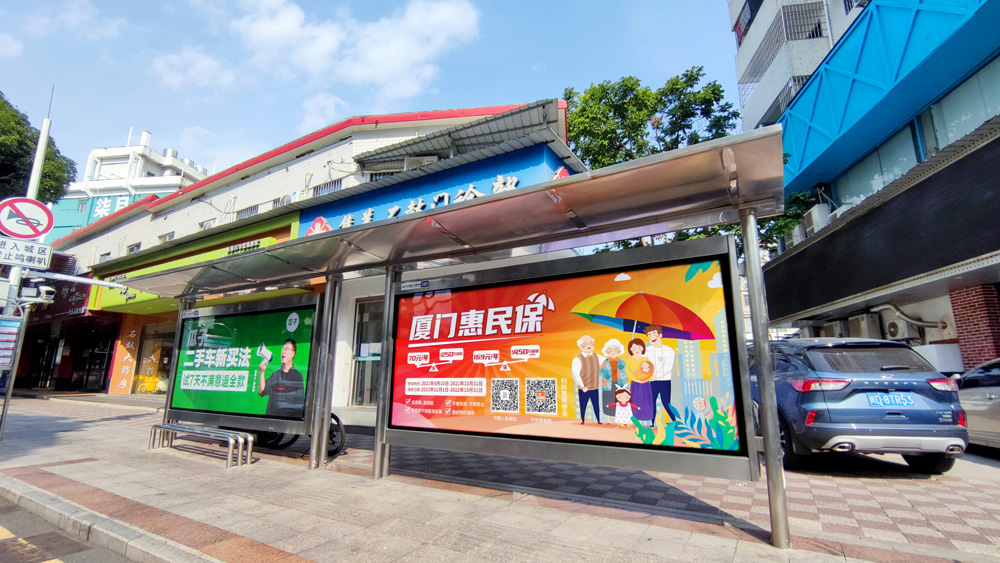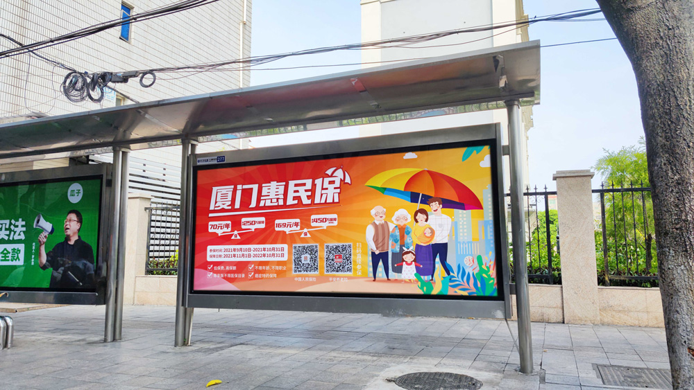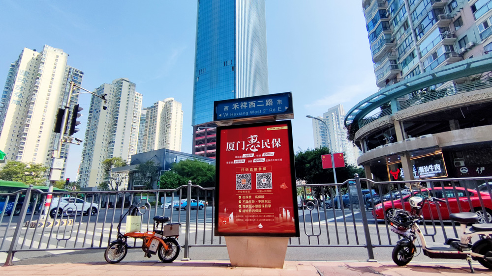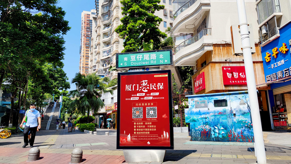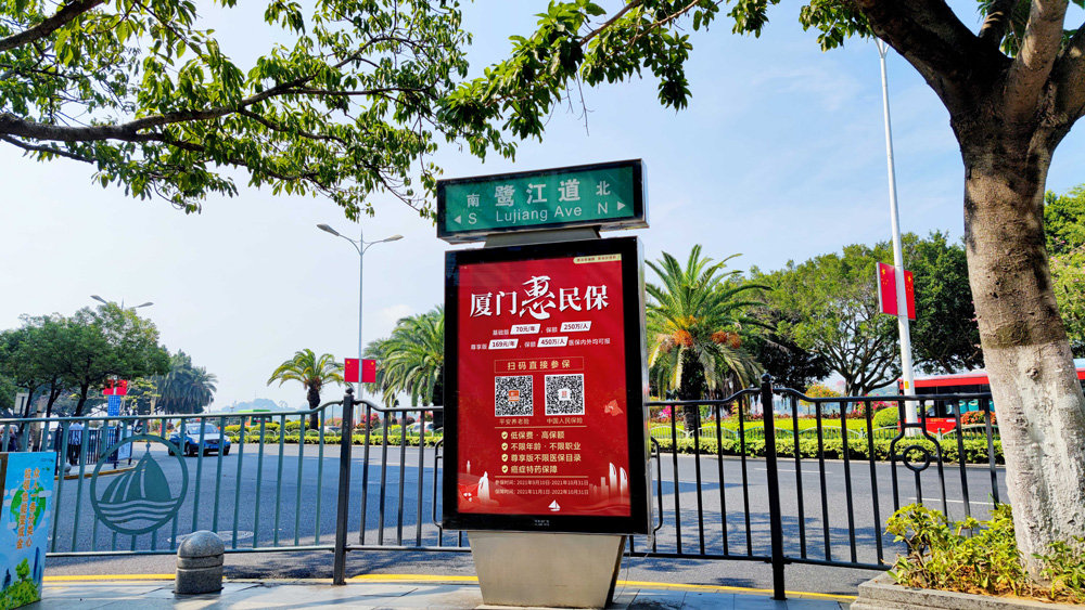 目前“惠民保”在全廈門市島內(nèi)外各個(gè)主干道及主干道交叉口、黃金的人流車流途徑處、居民生活住宅區(qū)等路段投放多個(gè)城市路名牌、公交車候車亭。