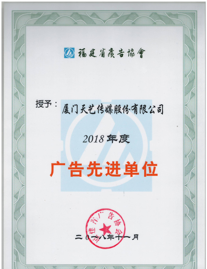 2018年福建省廣告界在推動(dòng)廣告業(yè)發(fā)展中,勇于開拓,努力創(chuàng)新,取得了優(yōu)異的成績,為福建經(jīng)濟(jì)發(fā)展和社會進(jìn)步作出了巨大貢獻(xiàn),涌現(xiàn)了一批先進(jìn)單位。為了表彰先進(jìn),樹立典型,推動(dòng)工作,再創(chuàng)輝煌,福建省廣告協(xié)會于12月20日舉辦了第七屆第三次理事會,并授予了廈門市天藝傳媒股份有限公司“福建省廣告先進(jìn)單位”的稱號。